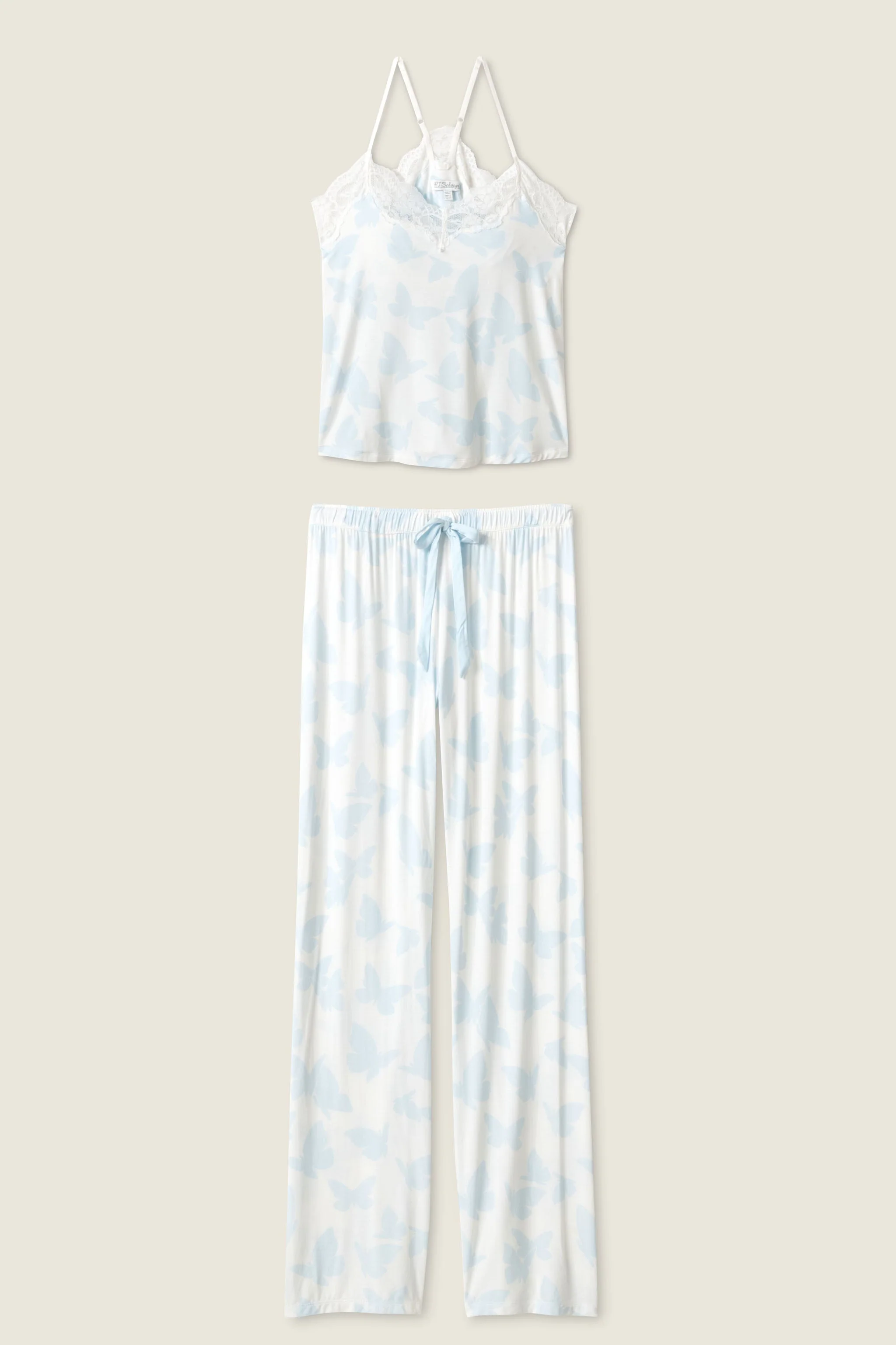 Soar into dreamland with this ivory-blue butterfly sleep set, crafted from ultra-soft modal jersey. The delicate lace-trimmed neckline on the cami top adds a romantic touch, while the straight-leg pant ensures a comfortable fit for ultimate relaxation. As part of our Bridal Collection, this dreamy set makes the perfect "something blue" for brides or a sweet addition to spring downtime.