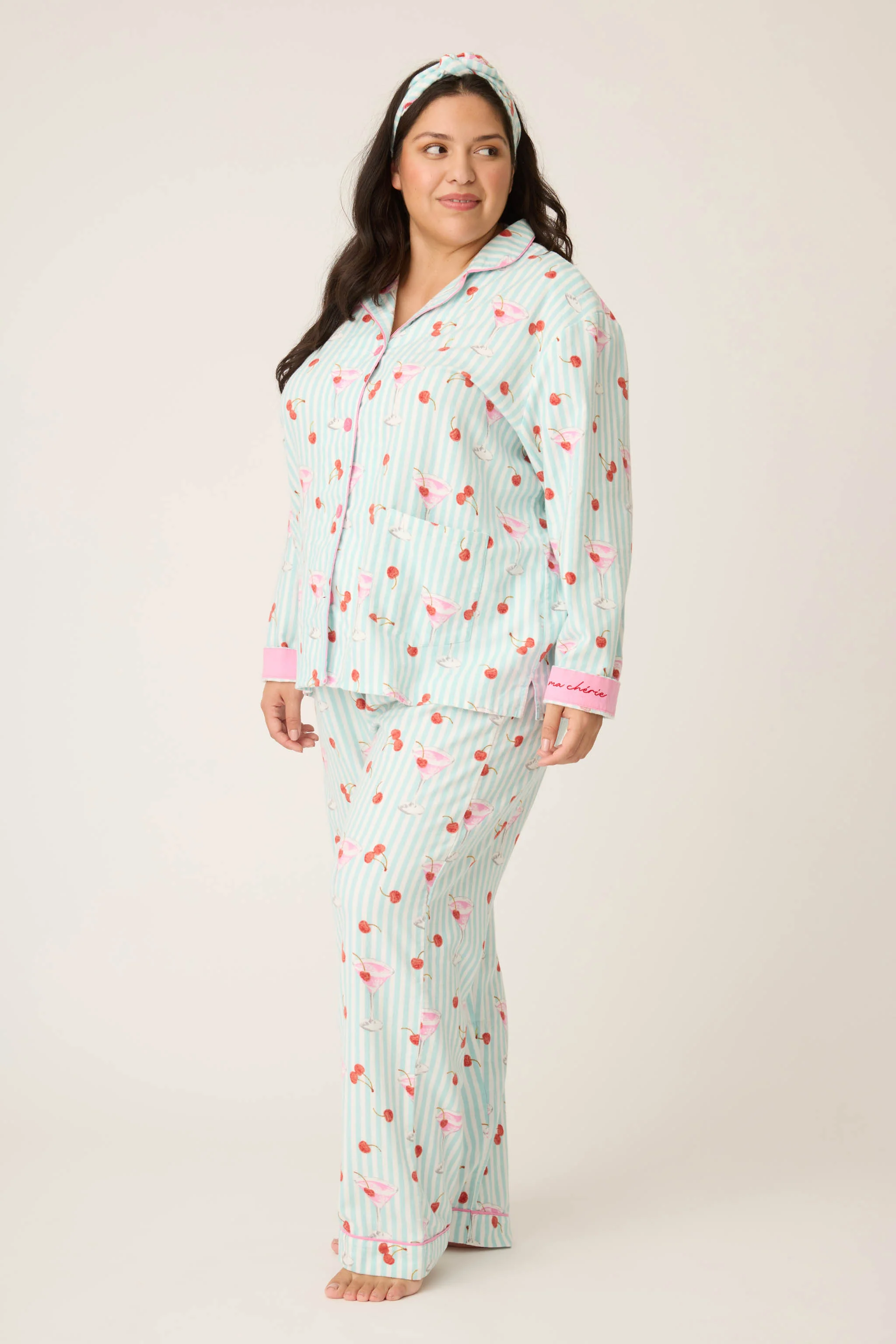 Sleep, lounge, repeat in this dreamy three-piece flannel set with a splash of happy hour charm. Made from soft cotton in a classic twill weave, it includes a button-up shirt, relaxed-fit pants, and a matching headband. Patterned with minty stripes, pink cocktails, and cheery little cherries, it’s a playful pick for sleepy nights, slow mornings, or unwinding with your favorite drink in hand.