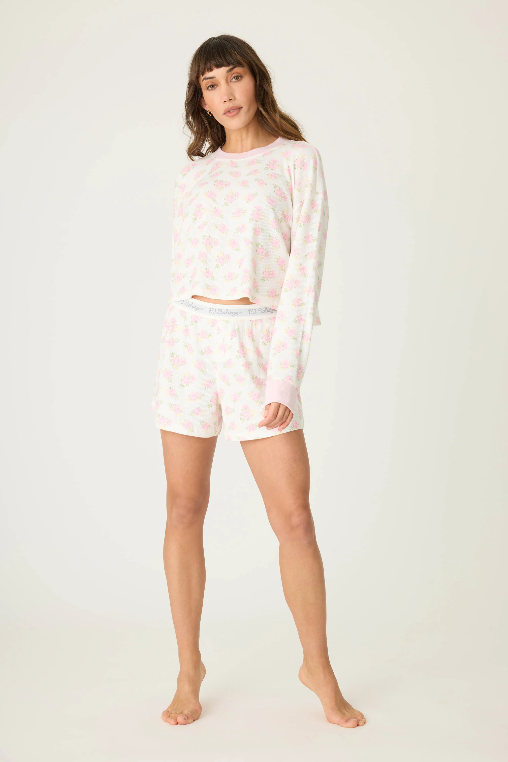 Built for slow starts and stop-and-smell-the-roses kind of days, this sweet floral PJ set is made for lazy mornings and hours of lounging. The long-sleeve cropped top features pink ribbed trim and a soft ivory backdrop covered in dainty rosebuds, paired with coordinating boxer-style shorts finished with an elastic logo waistband and faux button fly. The relaxed silhouette makes it feel laid-back, while the soft waffle texture adds just the right touch of cozy.