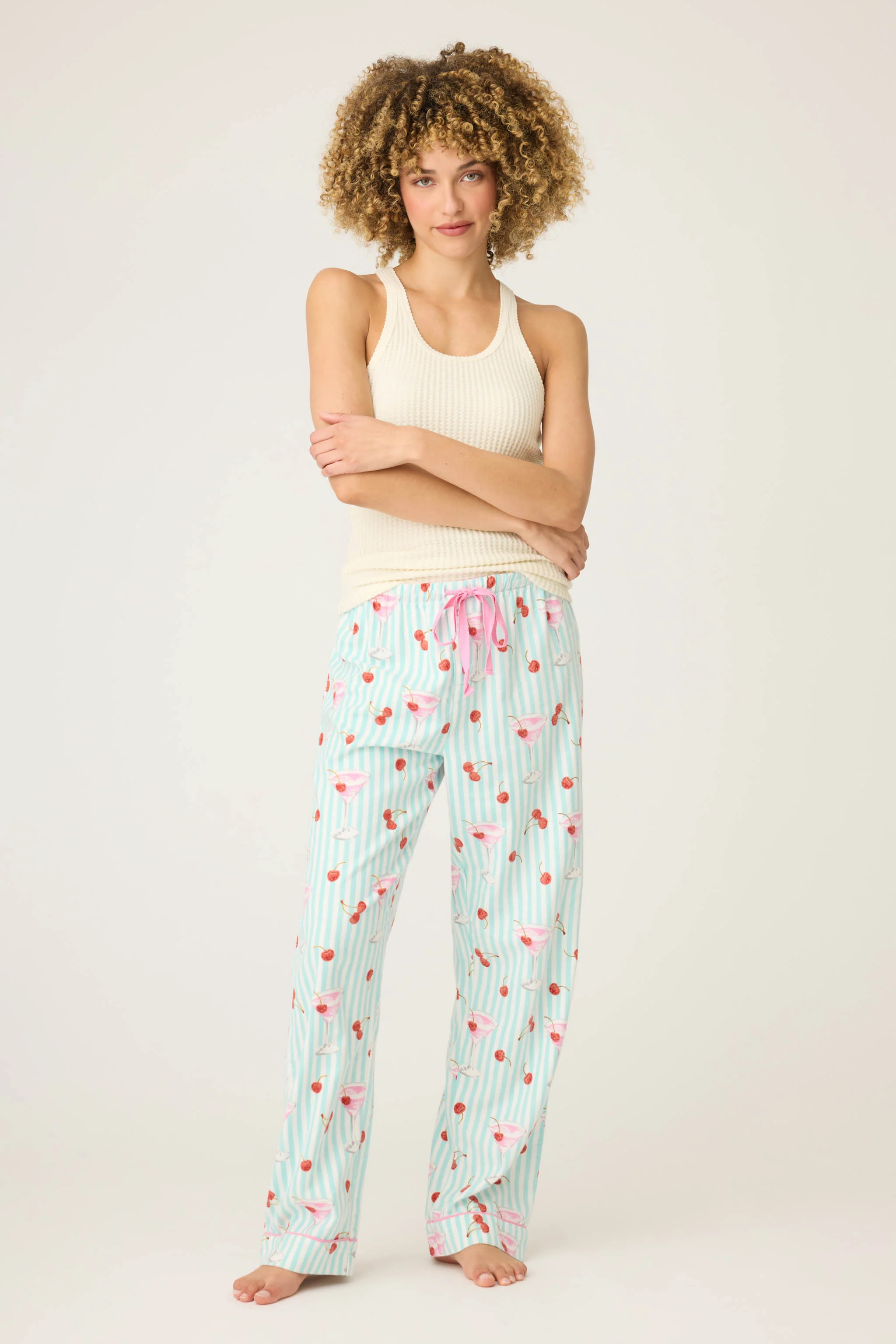 Cozy cotton flannel, meet happy hour. These full-length lounge pants are crafted in a classic twill weave and patterned with minty stripes, pink drinks, and cheery little cherries. Contrast cuffs and piped hems add a playful finish, while the relaxed fit and adjustable drawstring waist make them a dream for slow mornings, sleepy nights, or unwinding with your favorite drink in hand.