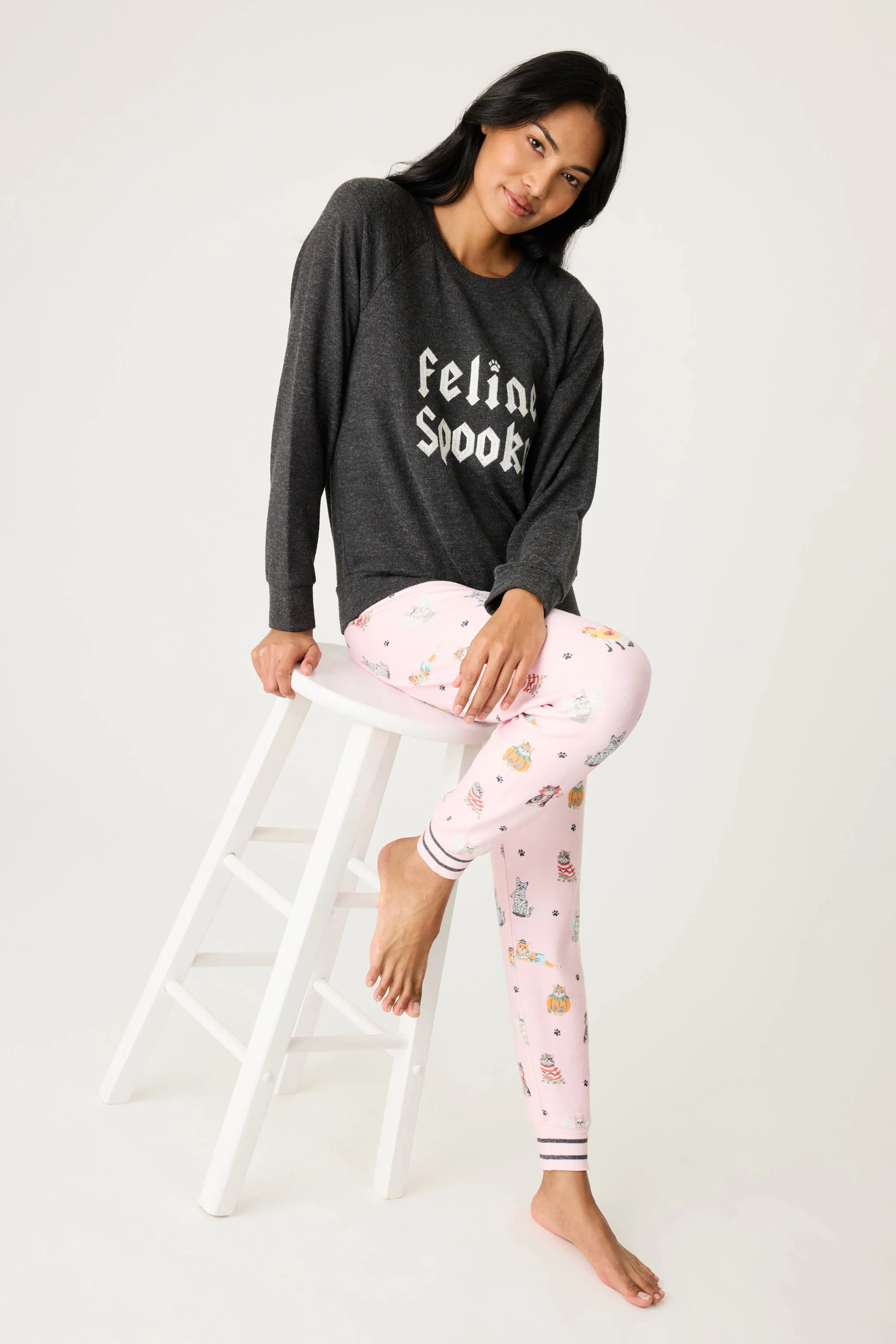 Playful and purr-fect for spooky season, this long-sleeve tee is your go-to for cozy fall moments. Crafted from melange peachy jersey in a deep charcoal shade, it features a bold “Feline Spooky” graphic that’s made for movie marathons or handing out candy in comfort.