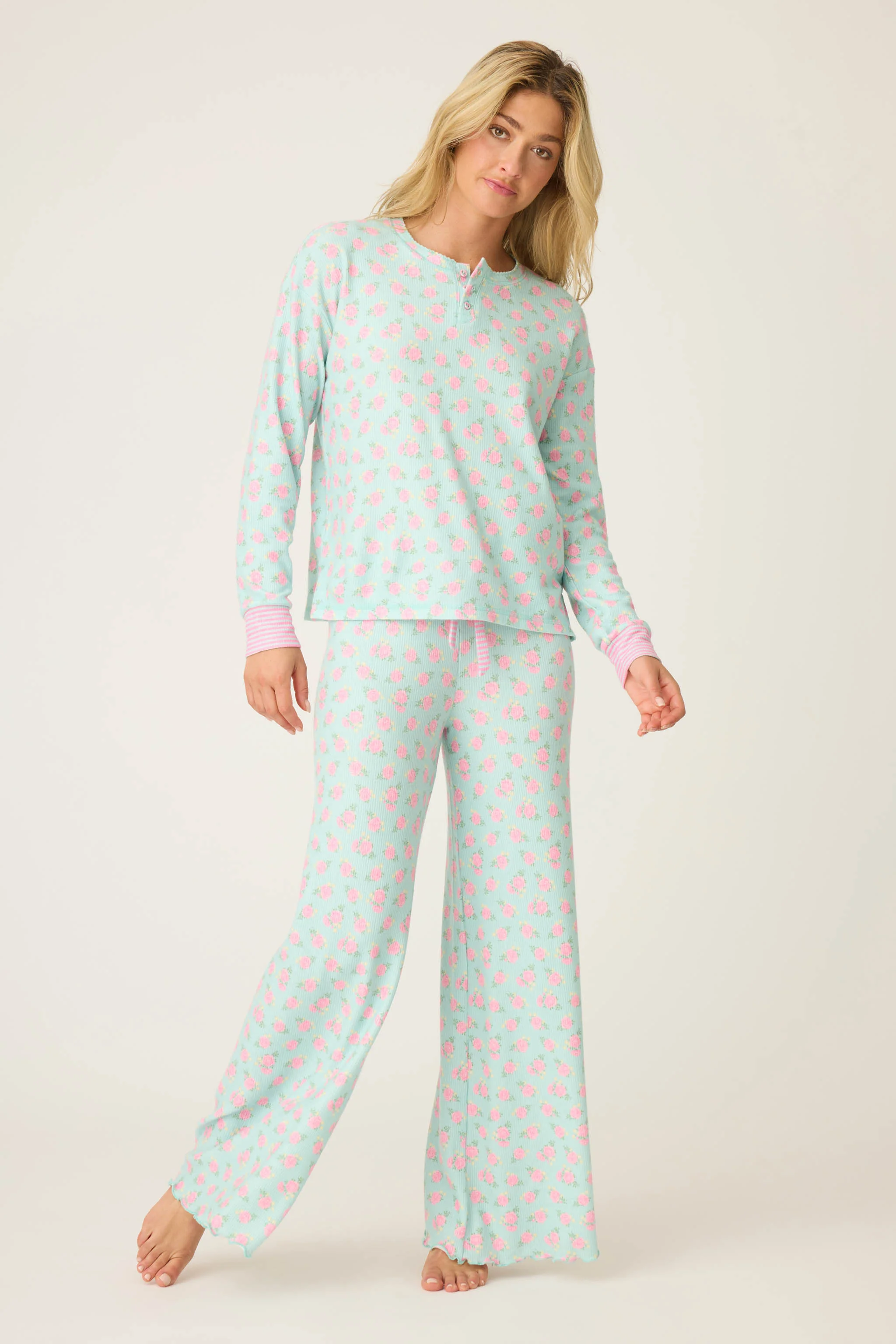A little garden magic to cozy up your nights. This soft mint thermal top, blooming with delicate roses, brings the same delight as a fresh bouquet. The long sleeves and three-button placket are framed with scalloped trim, while striped cuffs add a playful wink. The matching pants feature a relaxed fit with a drawstring waist detailed in the same pattern—bringing all the warm fuzzies and perfect for slipping into your personal sanctuary.