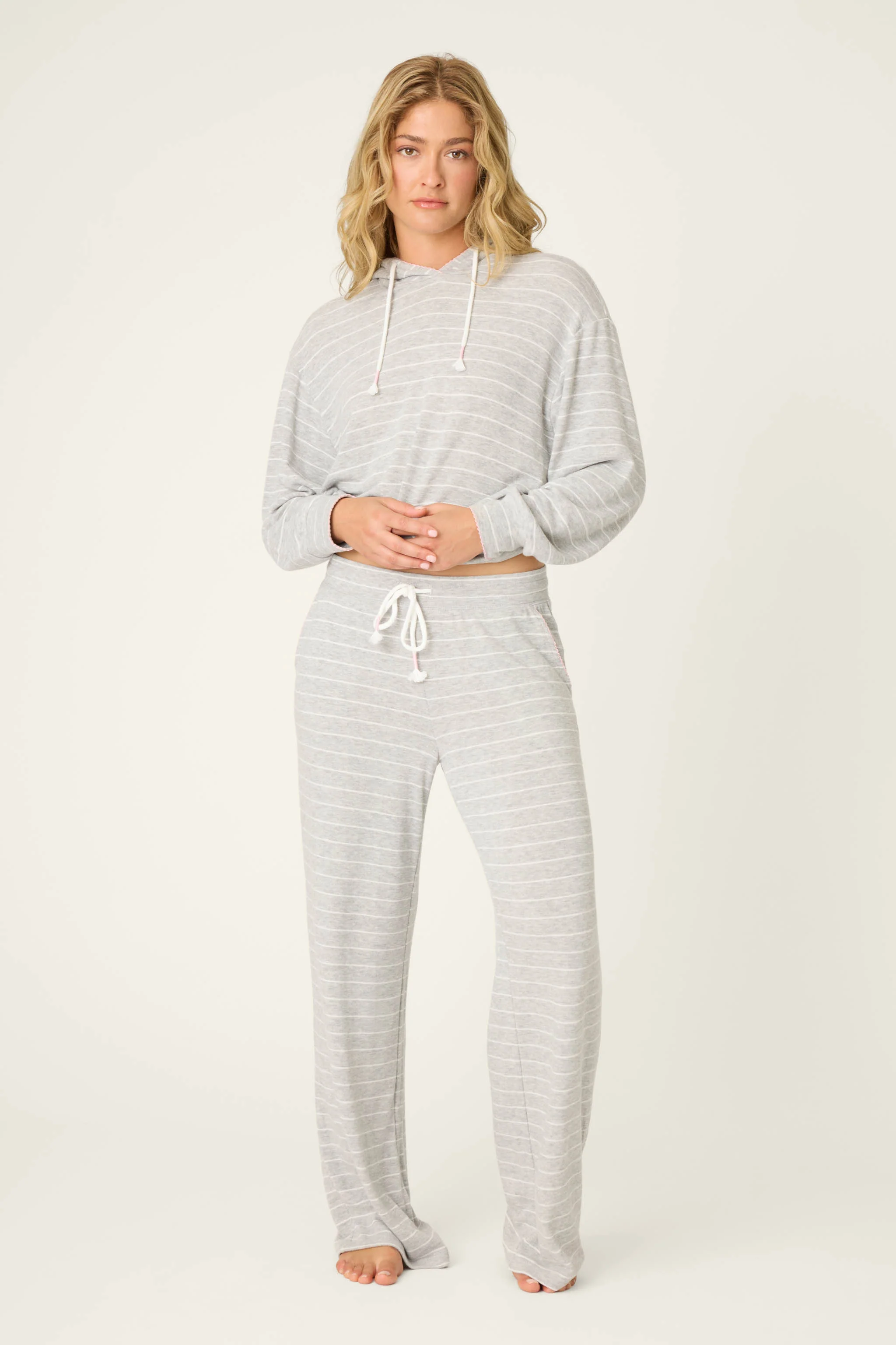 Timeless stripes with a sweet twist. These lounge pants are crafted from our melange peachy jersey with a relaxed fit, drawstring waist, and side pockets. The pink scalloped trim brings a feminine touch that adds a playful note to the classic shape. Pair it with the matching hoodie for a cozy set that’s as pretty as it is comfortable.