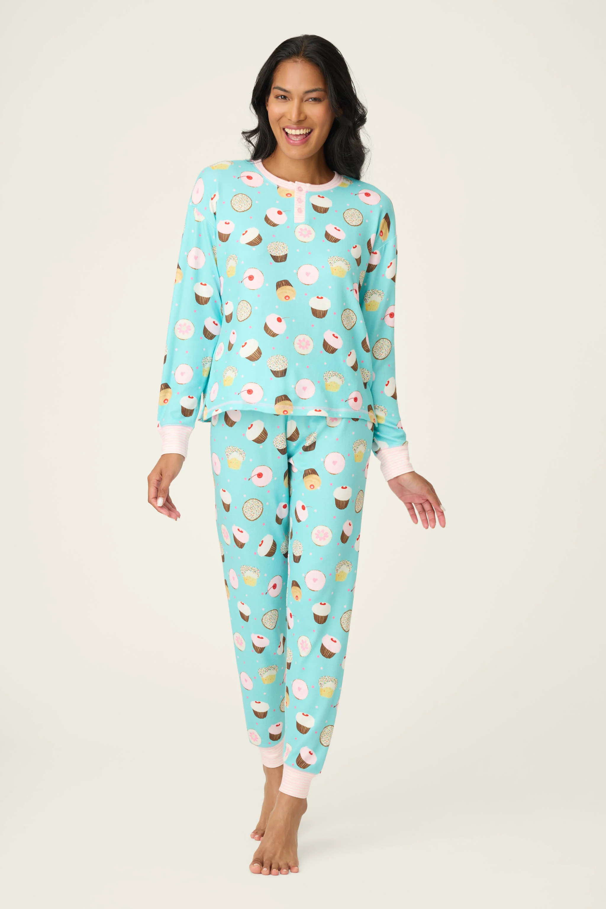 Soft, sweet, and delightfully cozy. This buttery-soft jersey pajama set features a relaxed long-sleeve top with pink striped cuffs and matching jogger-style pants. Covered in a pastel cupcake print, this Sprinkles Cupcakes collaboration brings the bakery to bedtime in the best way.