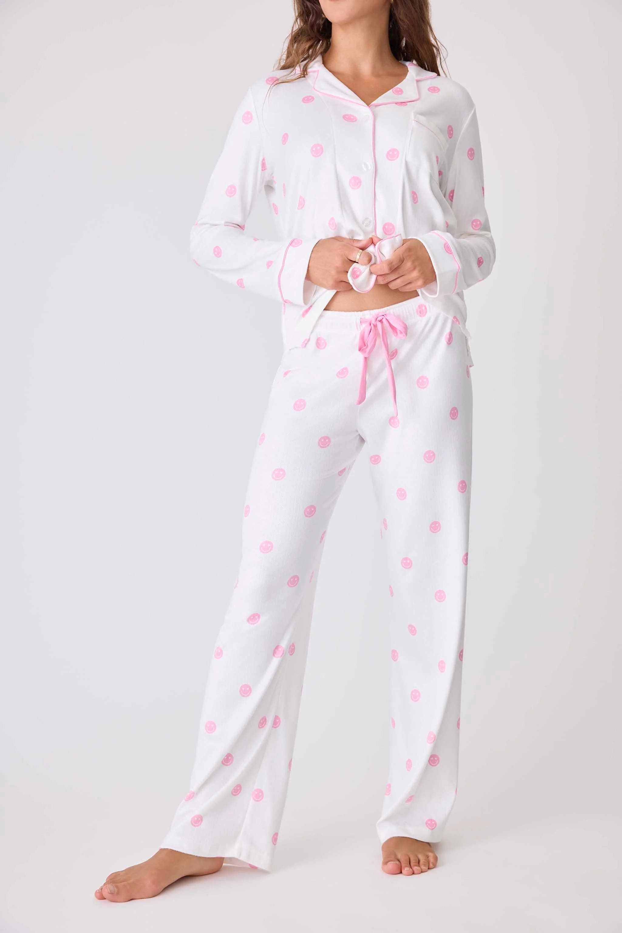 Exclusive collaboration P.J. Salvage x Susan G. Komen. The collection supports Susan G. Komen's mission to save lives by meeting the most critical needs of our communities and investing in breakthrough research to prevent and cure breast cancer. Our ivory pajama pants with a pink happy face pattern offer a blend of comfort and cheer. This exclusive PJS x Susan G Komen design not only ensures a restful sleep but also supports Susan G Komen’s mission. Enjoy lounging with a purpose!