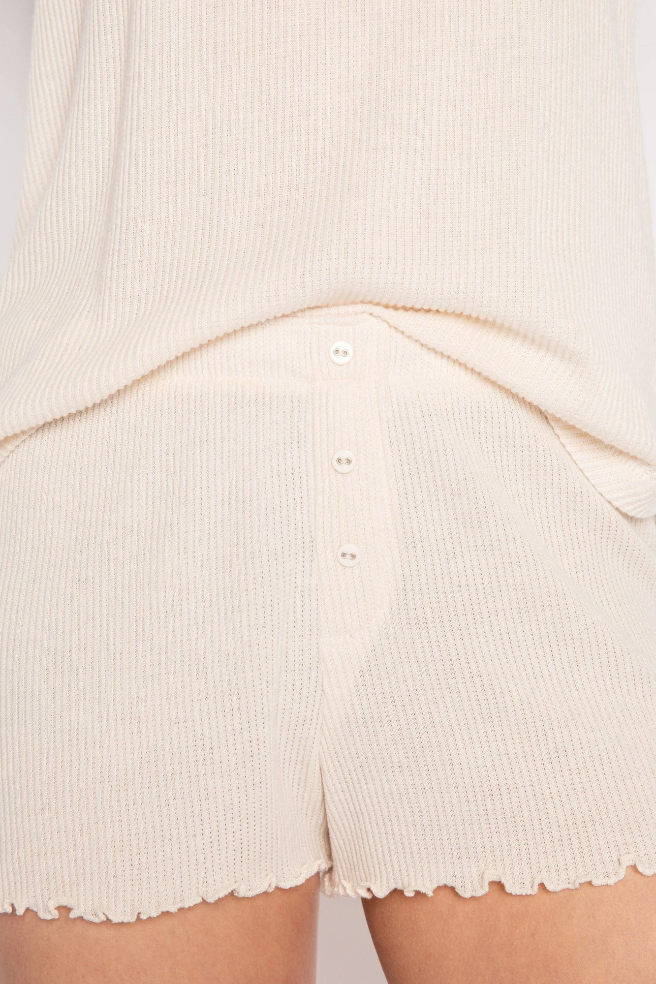 All the soft texture vibes in this 2x2 ribbed sleep set. A soft V-neck tank & mini-button short.